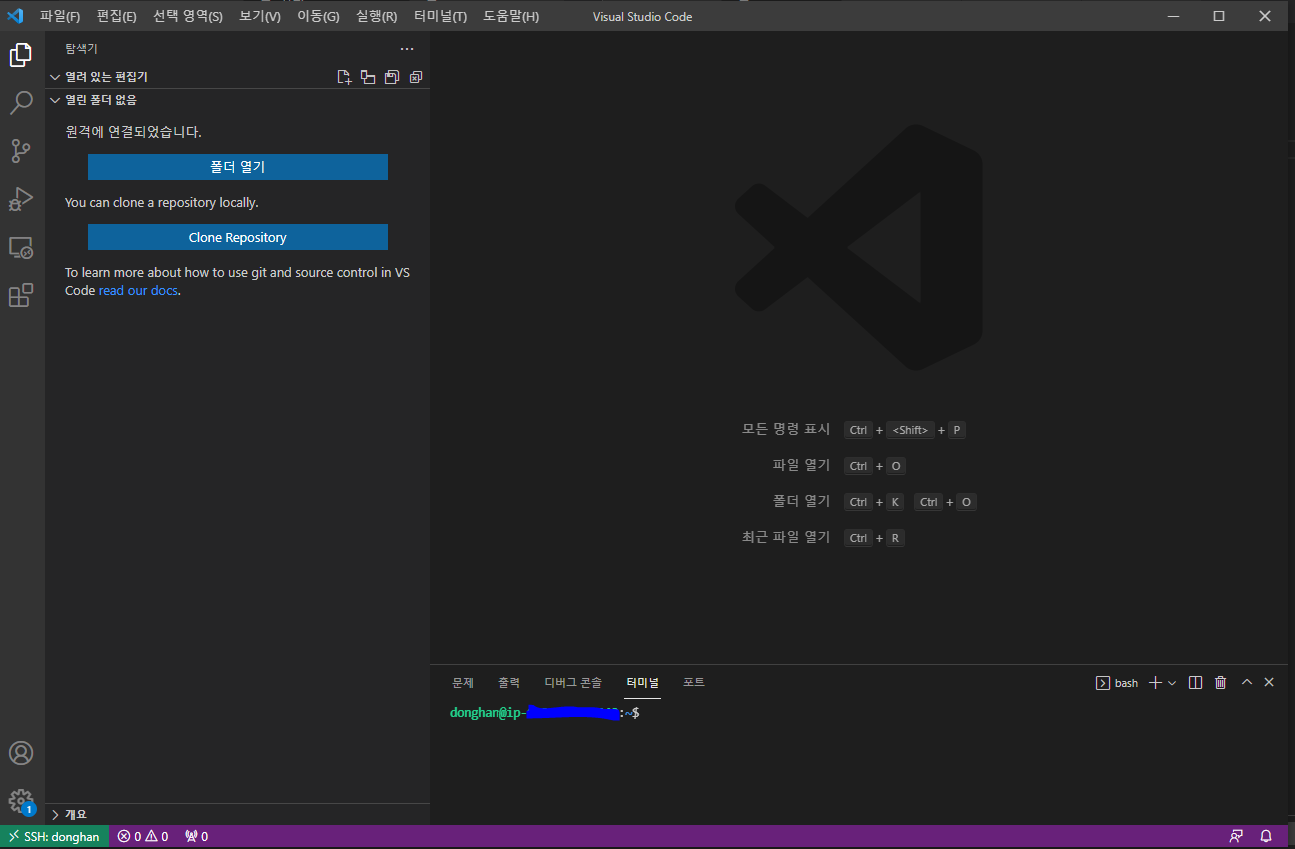 이를 누르면 별도의 VScode 창이 열리면서 해당 서버에 원격으로 접속된다.