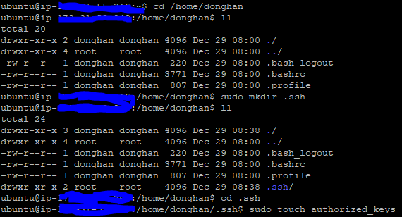 이제 사용자 명으로 /home/사용자명 디렉토리가 생성되었고 해당 디렉토리로 이동한 뒤, .ssh 경로를 생성한다. 그 다음 .ssh 경로 내에 authorized_keys 파일을 생성(touch)한다. 명령어는 다음과 같다.