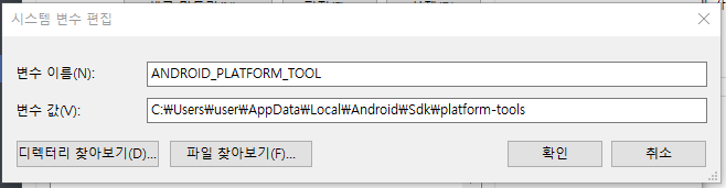 adb 명령어에 대한 전역 접근이 필요하기에 환경변수를 등록해줘야 한다. 우선 Android SDK Platform-Tools 가 어느 경로에 설치되었는지를 확인하자. 아마 위와 같은 방식으로 설치했다면, 아래와 같은 경로에 설치되어 있을 것이다.