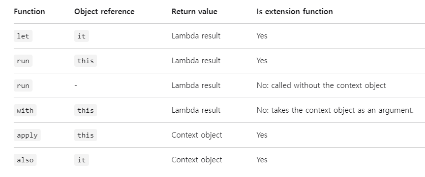 코틀린 표준함수 중에는 리팩토링 또는 자원 낭비를 방지할 수 있도록 돕는 스코프 함수 몇 가지가 있다. 이 함수들은 확장함수로 구현된 함수로 람다식을 이용해 접근하는 것이 일반적이다. 이 함수들의 가장 큰 목적은 블록 내의 코드를 각 객체의 문맥(Context) 내에서 실행하도록 한다.