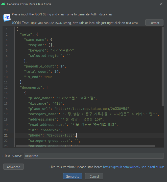 그대로 복붙하고 클래스 이름 지정후 , Generate를 누르면 필요한 데이터 클래스들이 생겨난다.