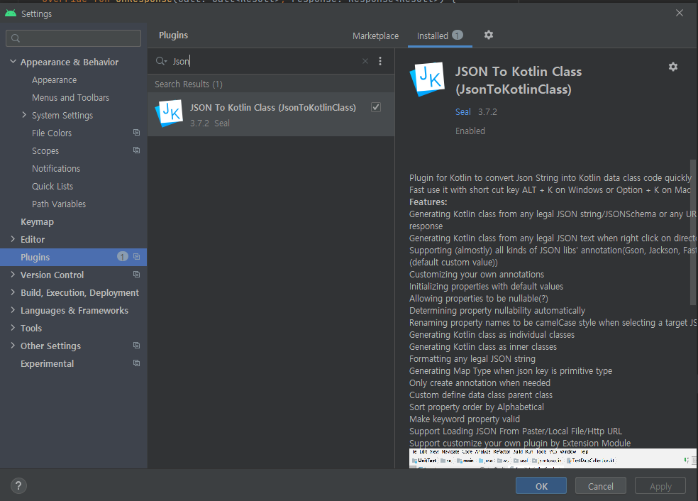 이를 위해 자동으로 필요한 클래스들을 정의하는 JsonToKotlinClass 플러그인을 소개한다.