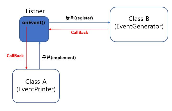 A가 리스너를 구현하여 이것을 B의 생성자에 넘겨준다. B는 생성자를 통해 자신을 구독하고자 하는 리스너를 등록한다. B는 상태 변화(Event)가 발생할 때 리스너의 onEvent() 함수를 호출하여 변화된 상태 정보를 전달한다. 리스너를 구현하고 있는 A는 Override 한 onEvent() 함수를 통해 상태 변화시마다 데이터를 전달 받아 활용한다.