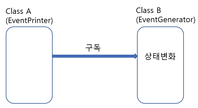 (여기서 B에서 그냥 출력하면 안되냐? 라고 할 수 있지만, 이건 이벤트의 발생 상황을 매우 간단한 예시로 보이는 것이다. 예를 들어 Swing 라이브러리나 안드로이드에서 클릭 이벤트를 감지하고자 할때, 직접 그 라이브러리 내부를 파고들어 어느 위치의 어느 클래스에서 print 함수를 두어야할지 바로 알아낼 수 있을까? 이런 시도 자체는 다소 무식한 방식일 뿐더러 시간의 낭비를 초래한다. 객체지향 프로그래밍을 하는 본질 자체를 무시한 것)