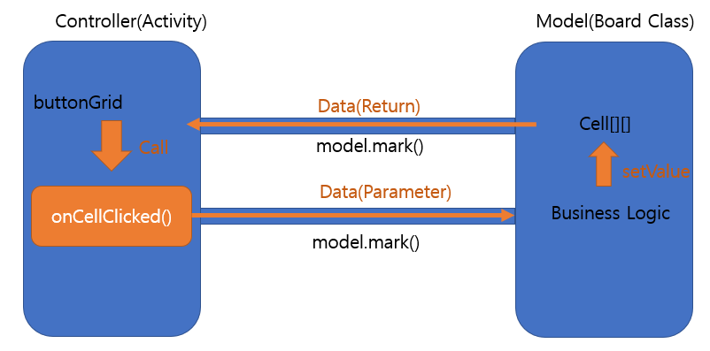 사용자가 샐을 터치하면 뷰는 무엇을 할지 모른다. 따라서 컨트롤러는 findViewById() 메서드를 이용해 각 뷰 컴포넌트들을 참조한뒤, 뷰에서 발생하는 터치 이벤트가 컨트롤러의 onCellClicked() 메서드를 호출하도록 연결되어있는 구조다. 컨트롤러는 onCellClicked() 메서드에서 모델(Board)의 mark 메서드를 호출하여 모델과 통신한다.