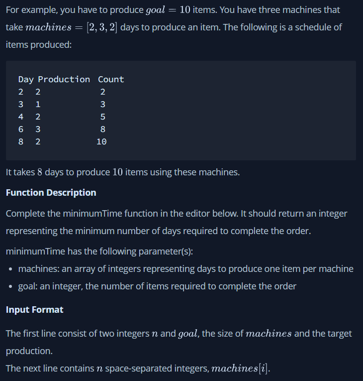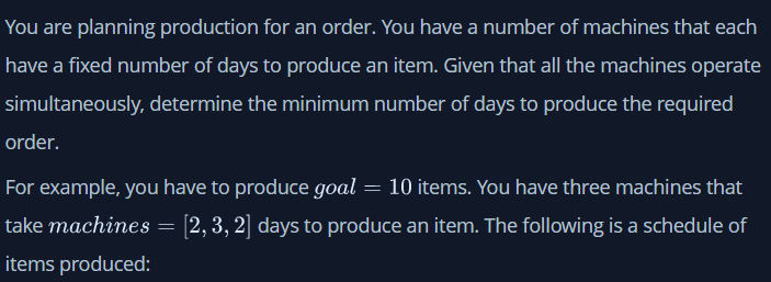 물건을 만드는 기계들이 있다. 이 기계들은 동시에 작동하며 각 기계는 물건 하나를 생산하는데 몇 일이 걸린다. 예를 들어 machines = [2,3,2] 로 주어진다면, 3개의 기계가 각각 물건 하나를 생산하는데 걸리는 시간이 2일, 3일, 2일 이다. 물건을 10개 만드는 것이 목표라면, 아래와 같은 스케줄을 가지면서 최소 8일 후에 10개를 생산할 수 있다.